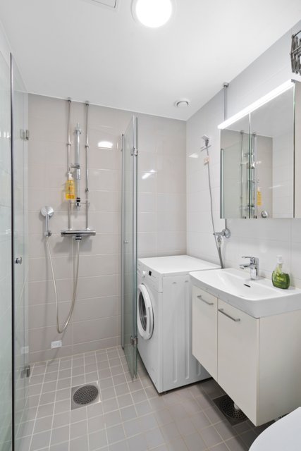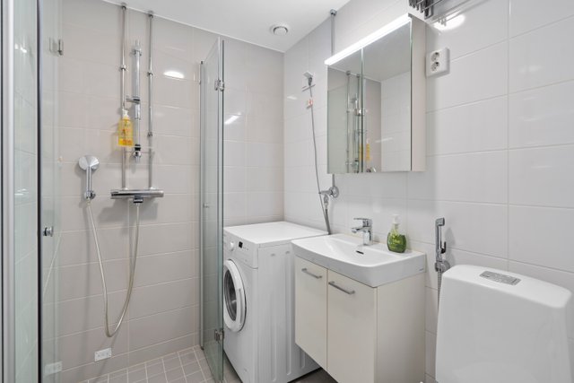 - WC-istuin, suihku, suihkuseinä, pesukoneliitäntä, lattialämmitys, peilikaappi, pesuallas, allaskaappi, ja bidee-suihku