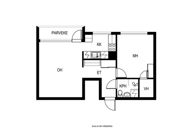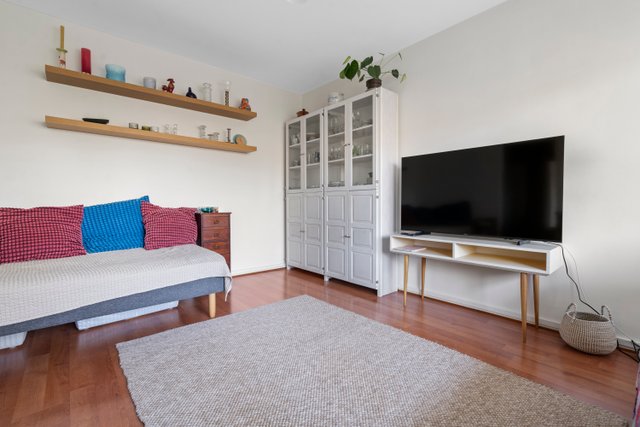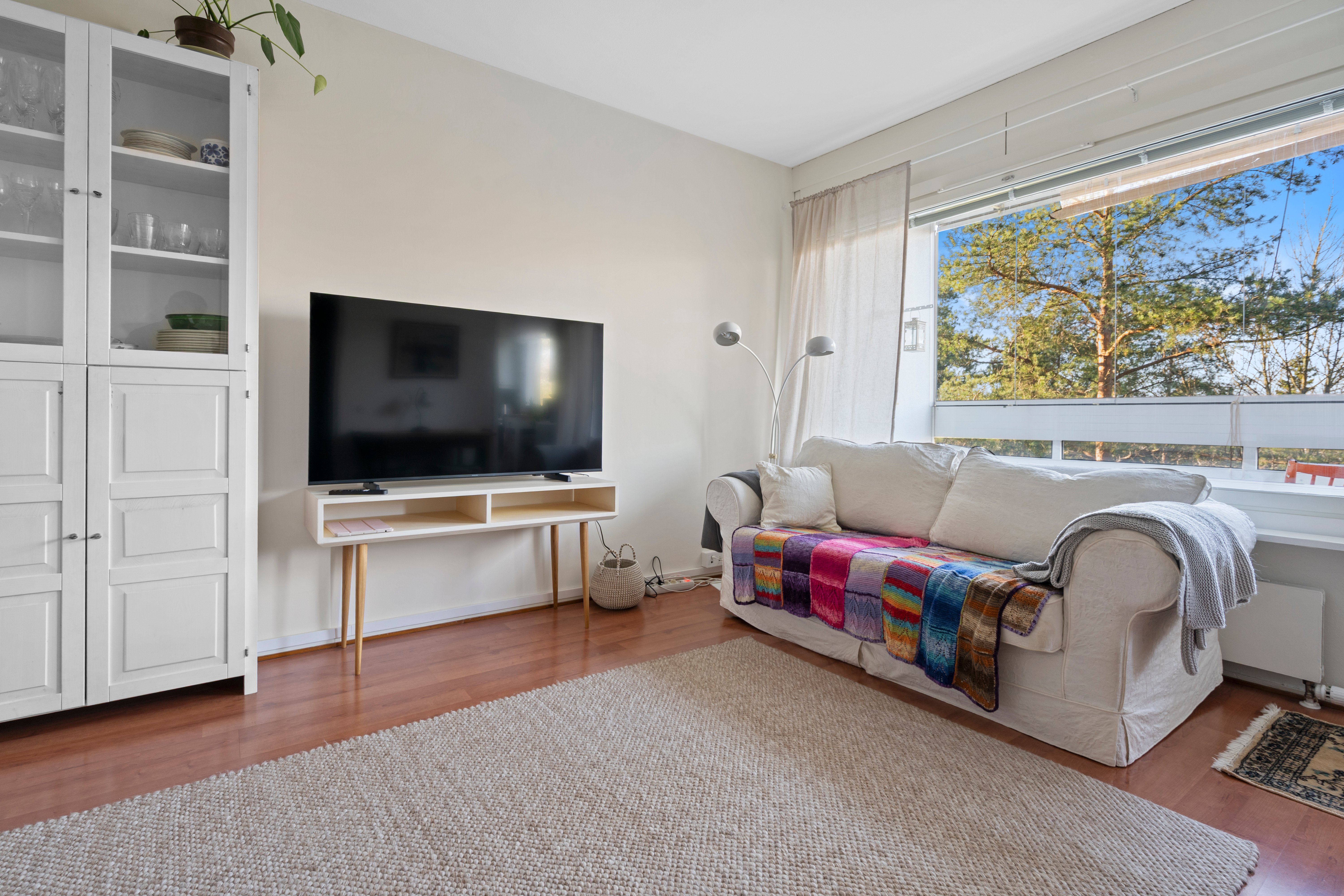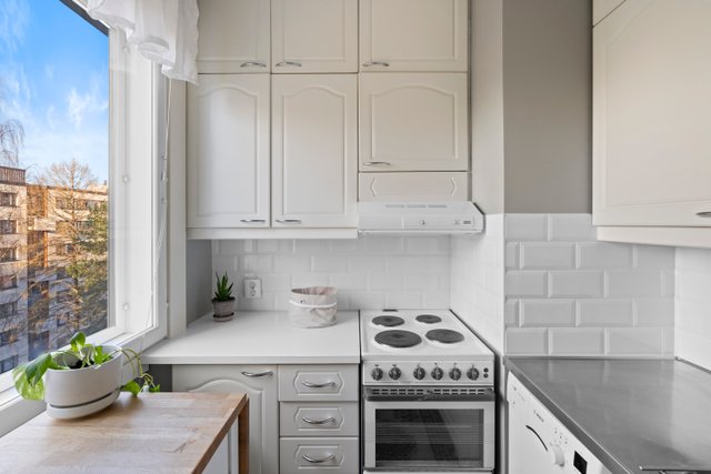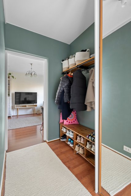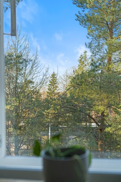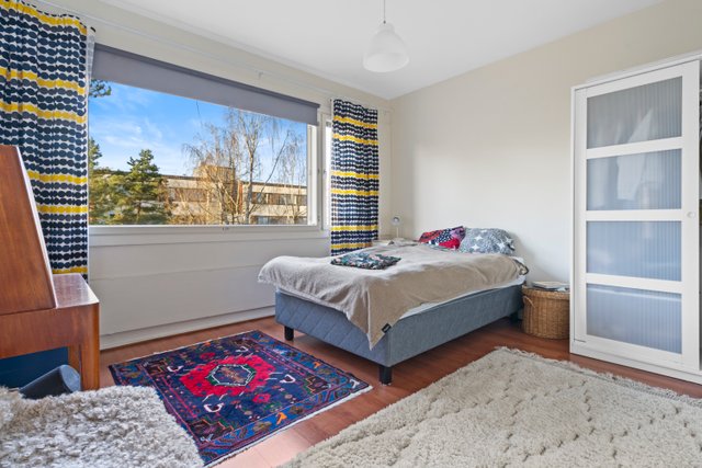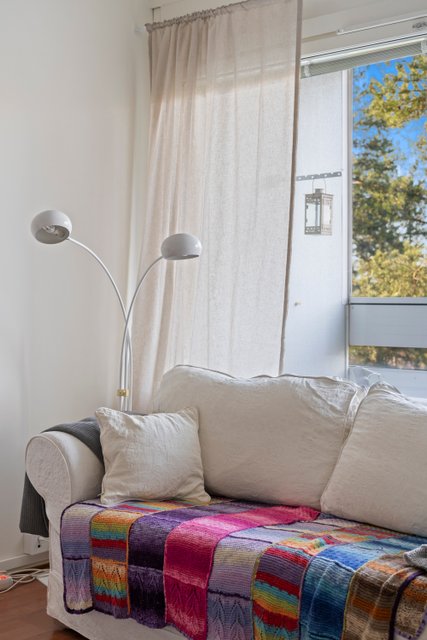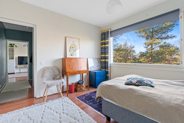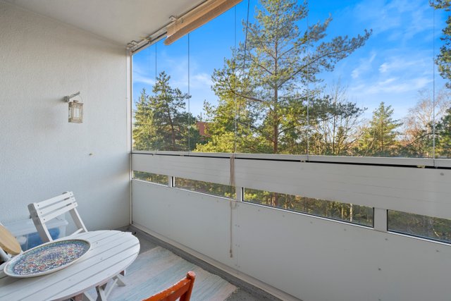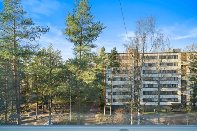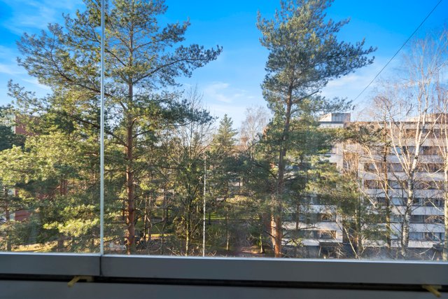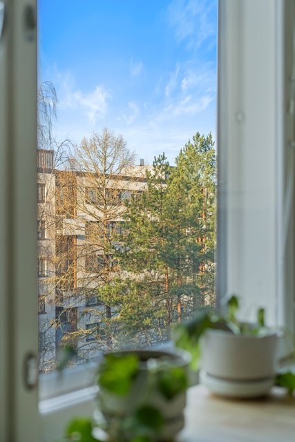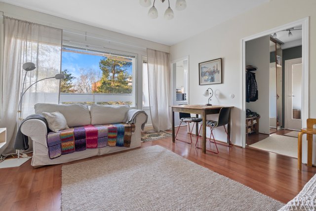 Asunnon ikkunoista avautuvat rauhalliset ja vehreät näkymät, jotka tuovat tilaan miellyttävää valoisuutta. Pohjaratkaisu on kaksioon poikkeuksellisen toimiva, jossa neliöitä on hyödynnetty tehokkaasti. Tilava olohuone, erillinen makuuhuone sekä vaatehuone tekevät arjesta sujuvan.