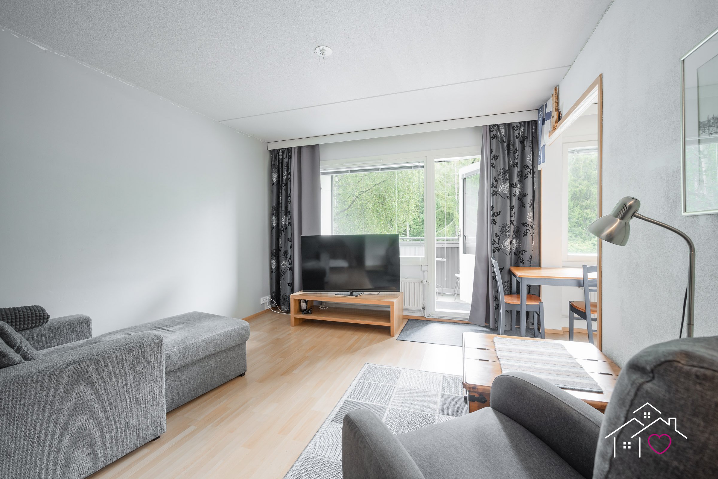 - Olohuoneen yhteydessä on alkovi ja lasitettu tilava parveke. Olohuoneen/alkovin lattia on laminaattia ja seinät on maalattu.