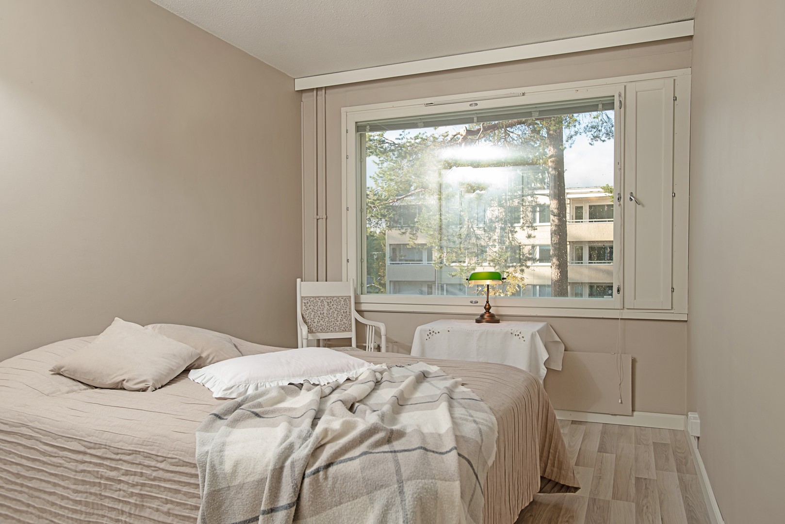 Moittoritieliittymään lyhyt, vain parin minuutin matka ja etätyöläiselle toinen makuuhuoneista tarjoaa toimivan väljät puitteet.
