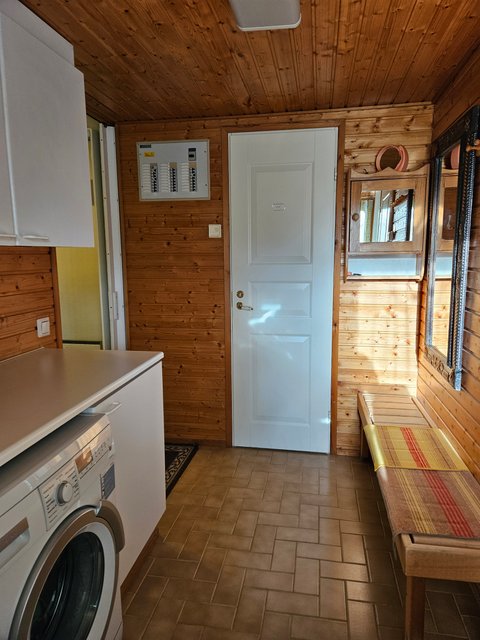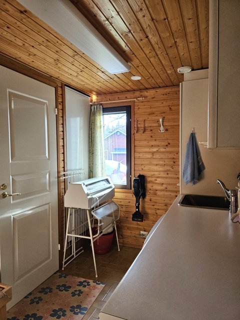 - Pesukoneliitäntä, lattialämmitys, pöytätaso, pyykkikaapit, pesuallas, lattiakaivo lämminvesivaraajan alla, ja pesukone