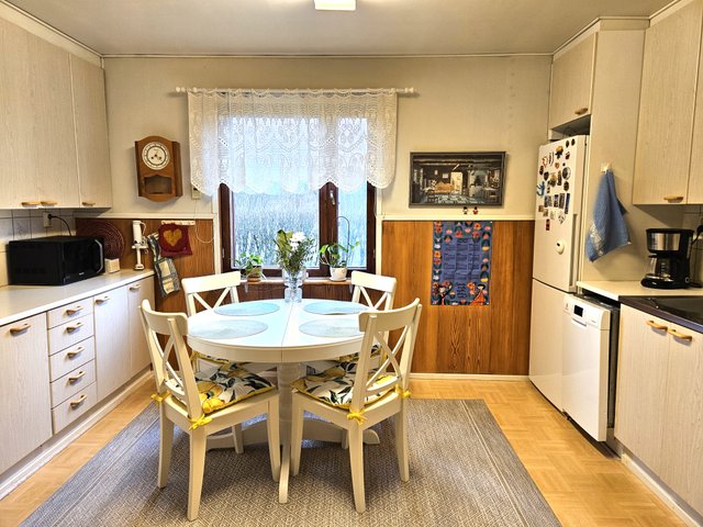 Talon sisätilat ovat kodikkaat ja toimivat. Keittiö on päivitetty vuonna 1994 ja lisäsiipeen rakennettu tilat saunalle ja kodinhoidolle.