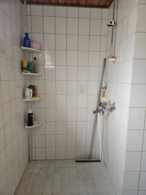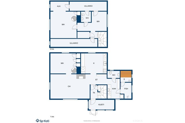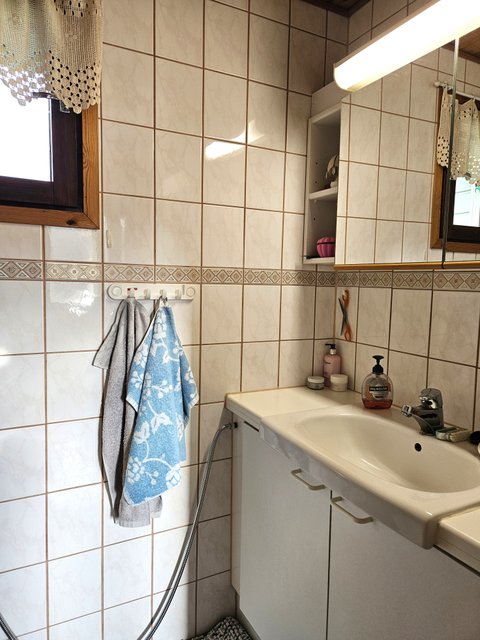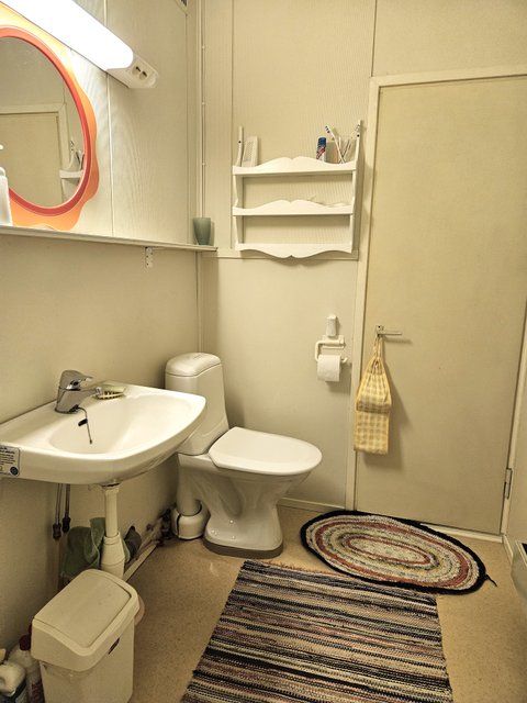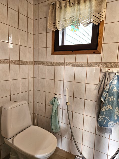 - Alakerran wc: lattia laattaa, seinät kaakelia, bidee, pesuallas, peilikaappi, allaskaappi Yläkerran wc: lattia muovimattoa, seinät maalattu, pesuallas, peili