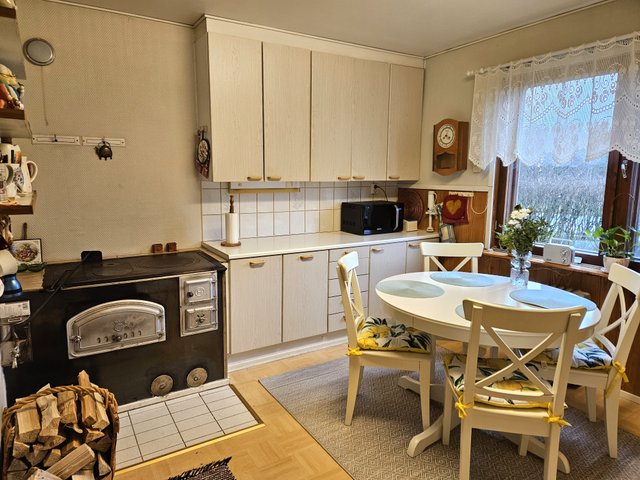 Keittiössä mukavaa lämpöä antaa perinteinen hella-leivinuuni, jossa paistelet maistuvat padat ja piirakat.