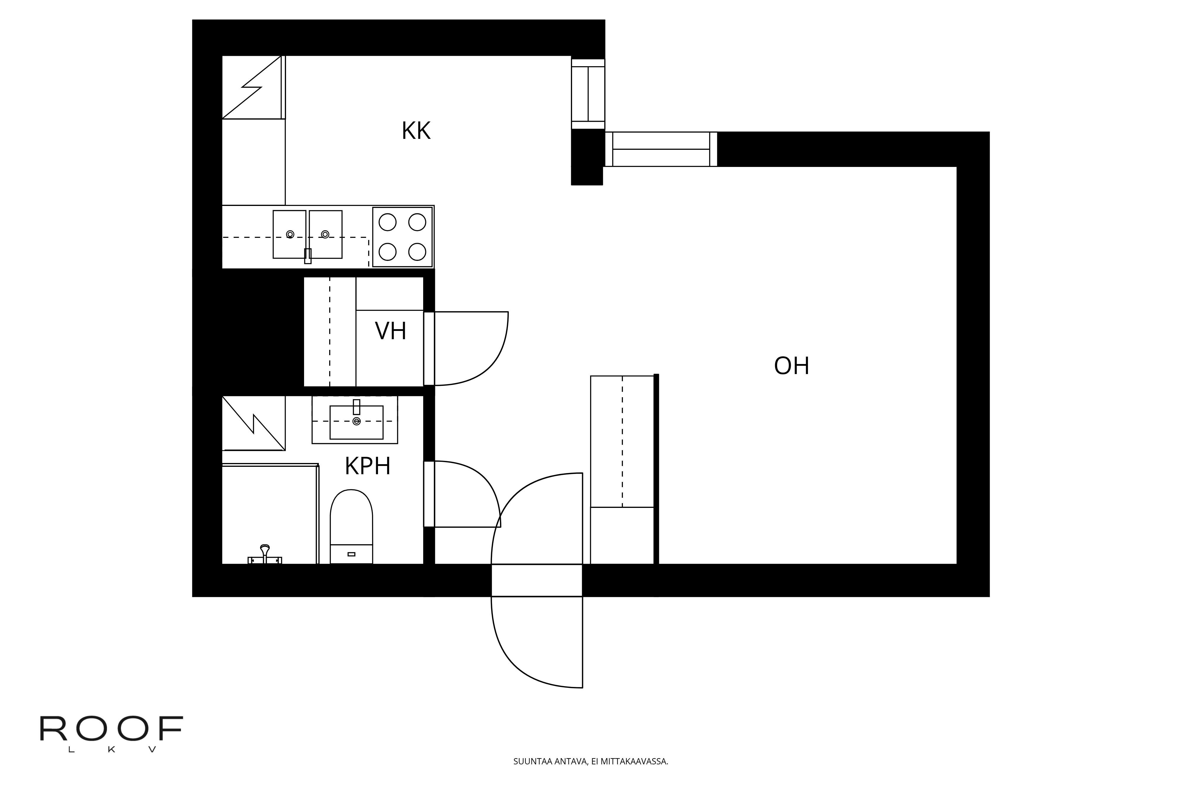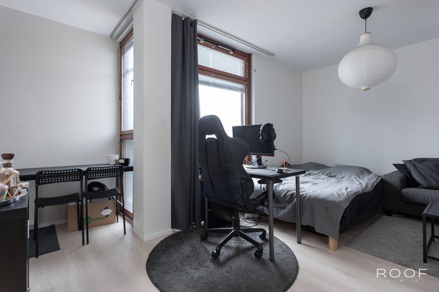 Asunnon olohuone ja makuutila muodostavat yhtenäisen tilan. Kokonaisuuteen mahtuu hyvin sänky sekä olohuonetilaa. Tyylikäs kylpyhuone on varustettu kaikilla tarvittavilla mukavuuksilla. Eteisessä on käytännöllinen peililiukuovikaapisto ja erillinen vaatehuone tuo lisää säilytystilaa.