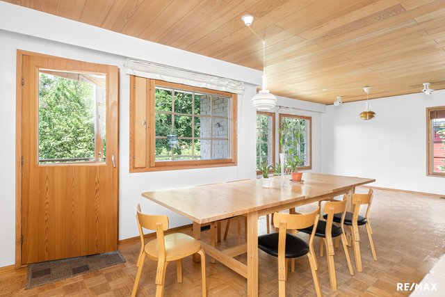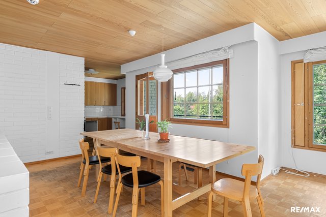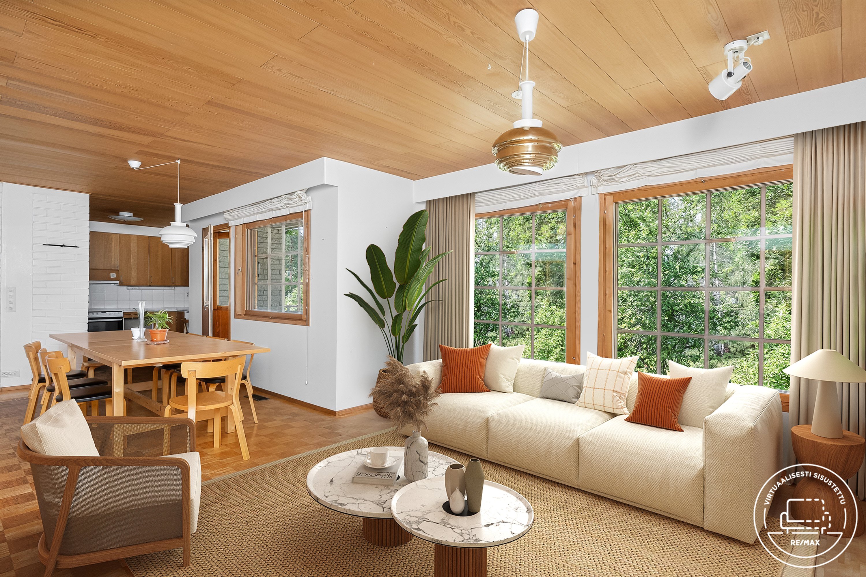 Asunnon yläkerrassa on avara olohuone, joka yhdistyy ruokailutilaan, ja sieltä avautuvat näkymät huoneiston suurelle piha-alueelle. Olohuoneen ja ruokailutilan kokonaisuus on suuri. Tässä tilassa järjestät juhlia isommallekin suvulle ja ruokailutilaan mahtuu suurikin ruokailuryhmä. Ruokailutilan ja keittiön parkettilattiat ovat kuluneet ja kaipaavat hiomista tai uusimista.