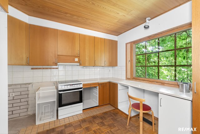 Vanha keittiö on osittain purettu keväällä sattuneen astianpesukoneen vuodon takia. Uuden omistajan tehtäväksi jäisi suunnitella ja asentaa oman mielensä mukainen uusi keittiö,