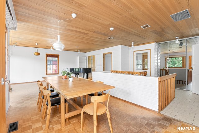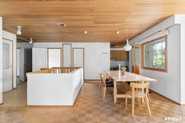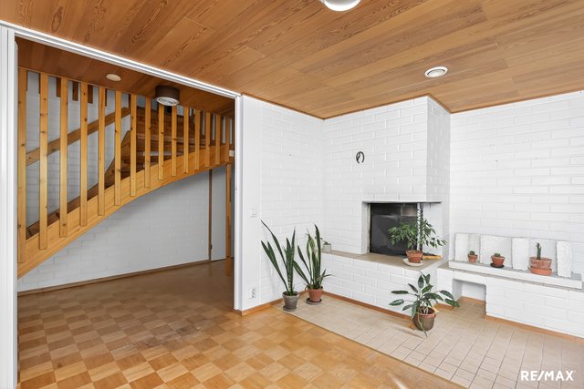 - Avara, suuri olohuone on sisääntulokerroksessa (ylempi kerros). Olohuoneen yhteydessä myös ruokailutila, jonka lattioissa kuluneisuutta. Olohuoneessa parkettilattiat. Seinät maalattu tai tiili.