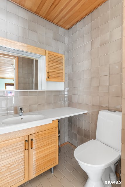 - Alakerran wc remontoitu 2003. Varustus: wc-istuin, allas, allaskaappi, peilikaappi, bidee-suihku. Laattalattiat, seinät kaakeloitu.