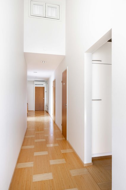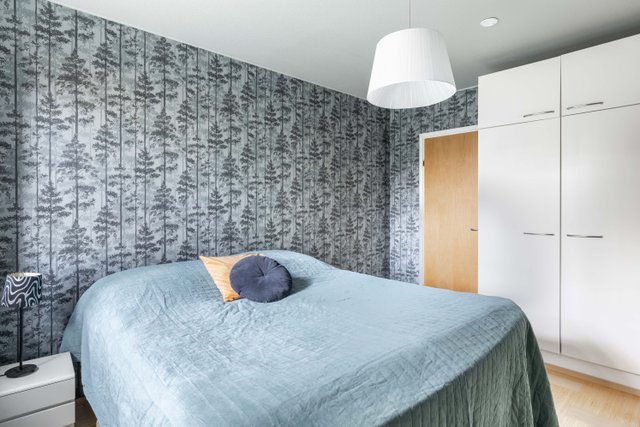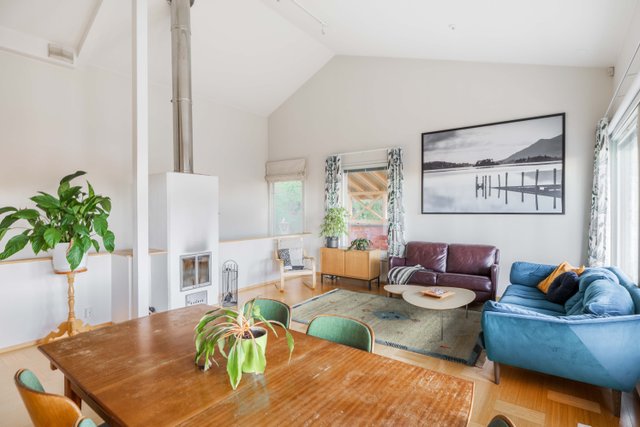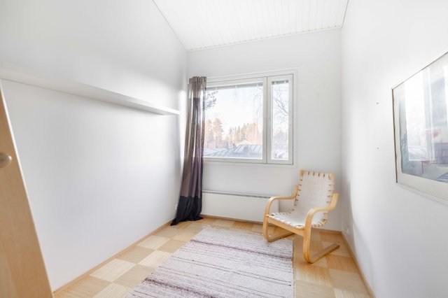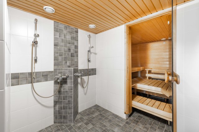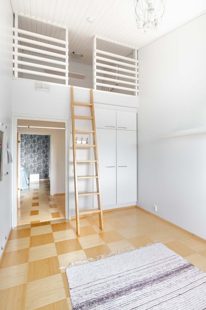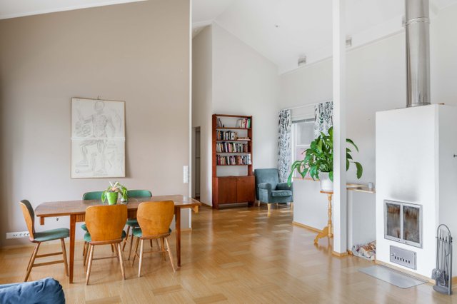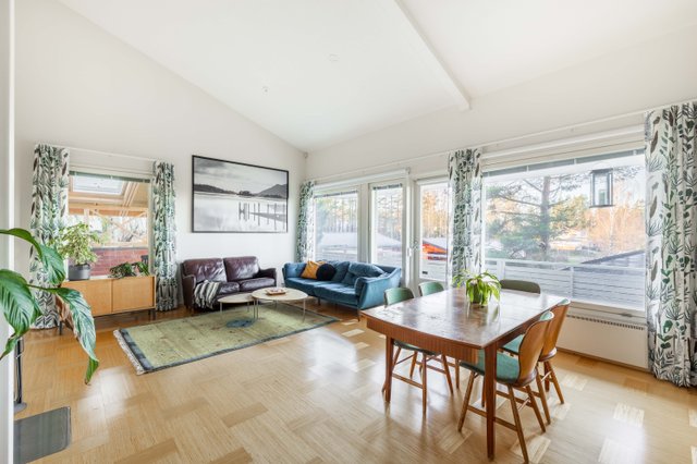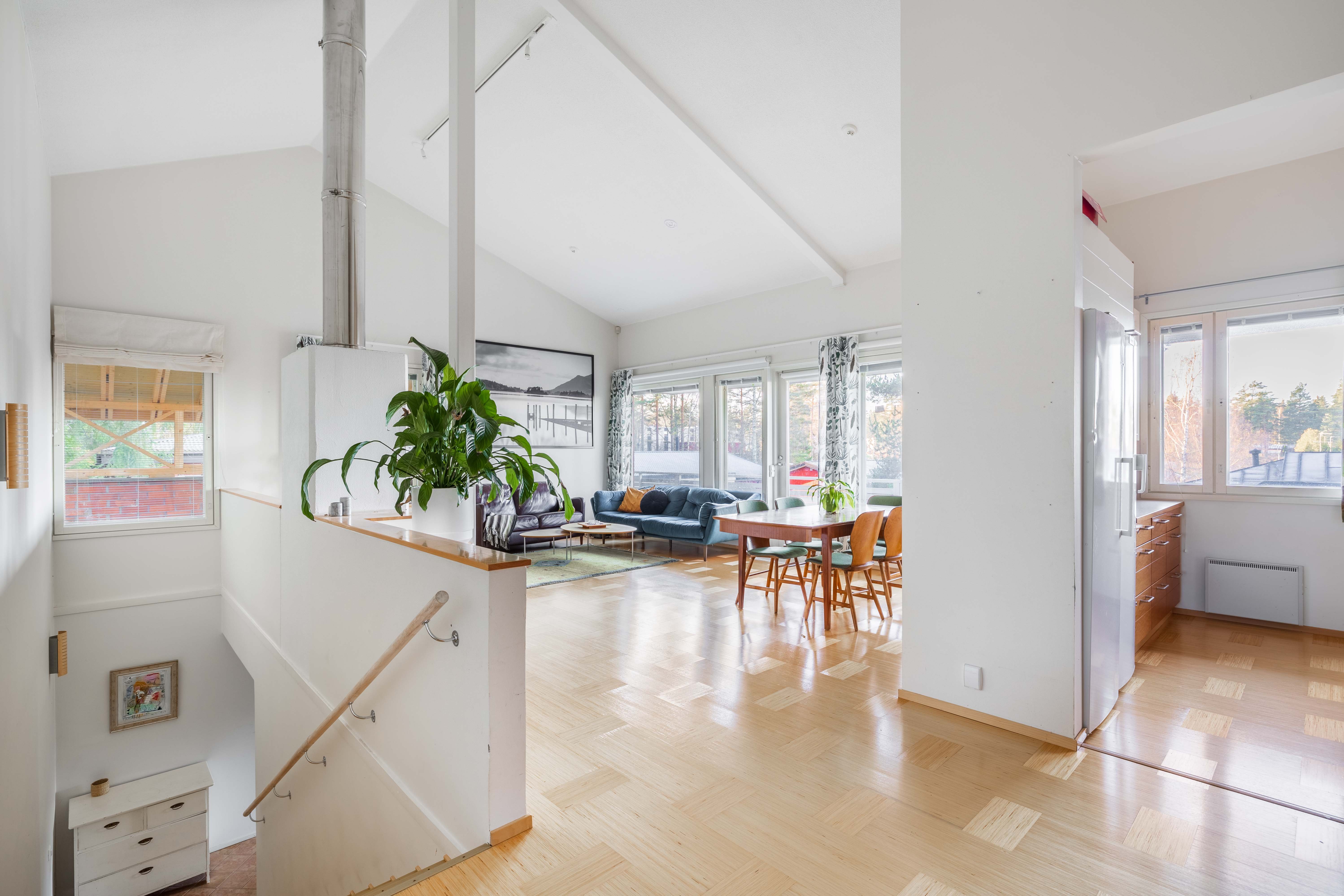 Tilat jakaantuvat kahteen kerrokseen ja yläkerrassa on lähes 6 metriä korkea olohuone, jossa varaava takka luo lämpöä ja tunnelmaa. Parveke jatkuu etelään avautuvalle katetulle terassille, joka kutsuu viettämään aikaa ulkona säällä kuin säällä. Erillisessä keittiössä on tilaa suuremmallekin ruokailuryhmälle. Kolmessa makuuhuoneessa on monikäyttöiset parviratkaisut, ja päämakuuhuonetta täydentää iso vaatehuone.