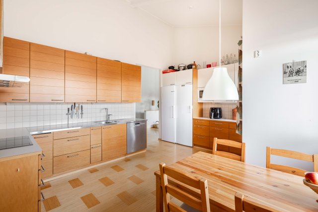 - Jääkaappi (Siemens), erillinen pakastin (Bosch), mikroaaltouuni (Siemens), astianpesukone (Siemens), erillisuuni (Siemens), ja liesituuletin (Smeg)