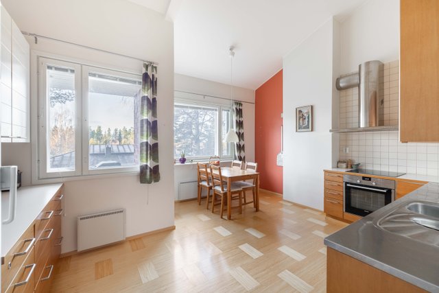 - Keittiön kaapistot: puun sävyiset alakaapit /valkoiset yläkaapit Keittiön välitila: vaalea laatta