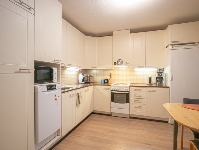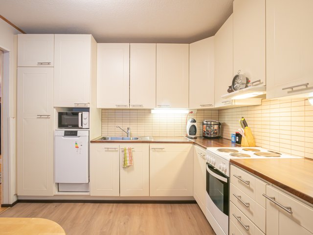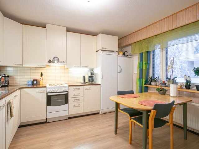 - Jääkaappi (Rosenlew, valkoinen), pakastin (Frigor, valkoinen), liesi (Valurauta, 500, valkoinen), liesituuletin (Husqvarna, 500, valkoinen), ja astianpesukone (Elvita, 450, valkoinen)