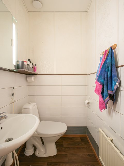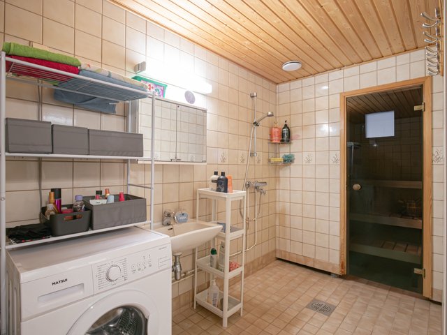 - Suihku, pesukoneliitäntä, lattialämmitys, pesuallas, ja peilikaappi