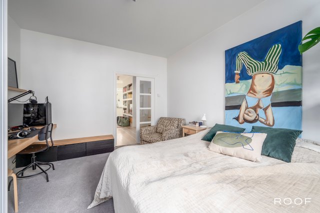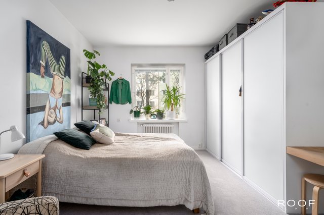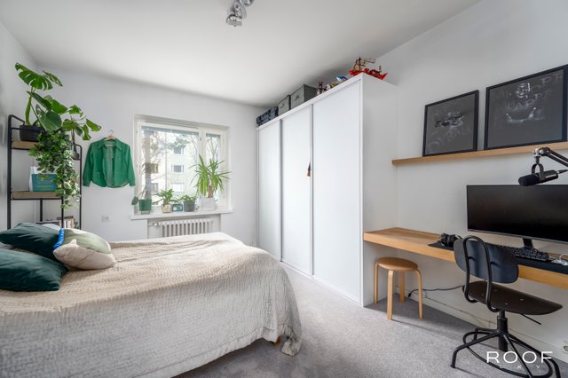 Makuuhuoneessa on älykkäästi suunniteltu työpiste sekä kustomoidut kaapistot, jotka tarjoavat runsaasti säilytystilaa. Huolella valitut materiaalit ja yksilölliset ratkaisut tekevät tästä kodista toimivan ja tunnelmallisen kokonaisuuden.