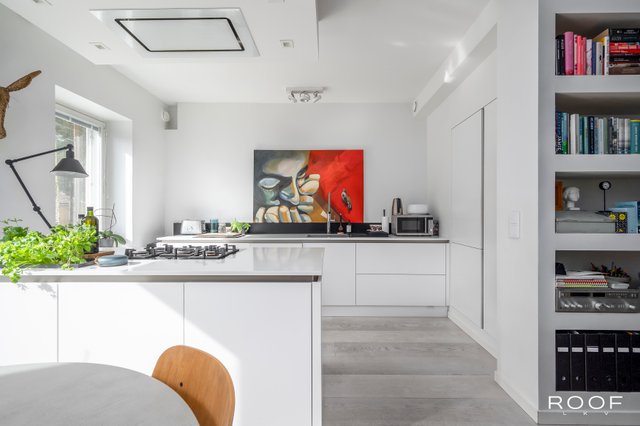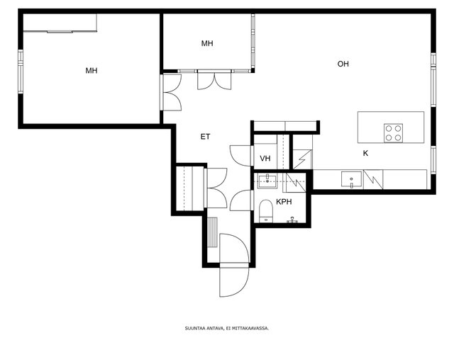 - Varustus: Integroitu jääkaappi/pakastin ja astianpesukone. Blanco tiskiallas ja ulosvedettävä keittöhana. Keittösaareke, jossa kaasuliesi ja uuni, katossa liesituuletin ja valot saarekkeeseen.Paljon säilytystilaa. Seinät: Maalattu. Lattia: Laminaatti.