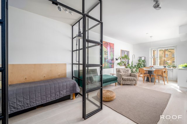 Tyylillä remontoitu läpitalon kaksio, jossa lasiseinäinen lisätila ja yksilölliset ratkaisut.