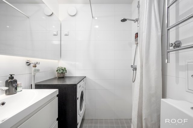 - Varustus: Wc-istuin, suihku, pesukoneliitäntä, peili, kiinteät valaisimet, kylpyhuonekaapisto. Seinät: Kaakeli. Lattia: Laatta.
