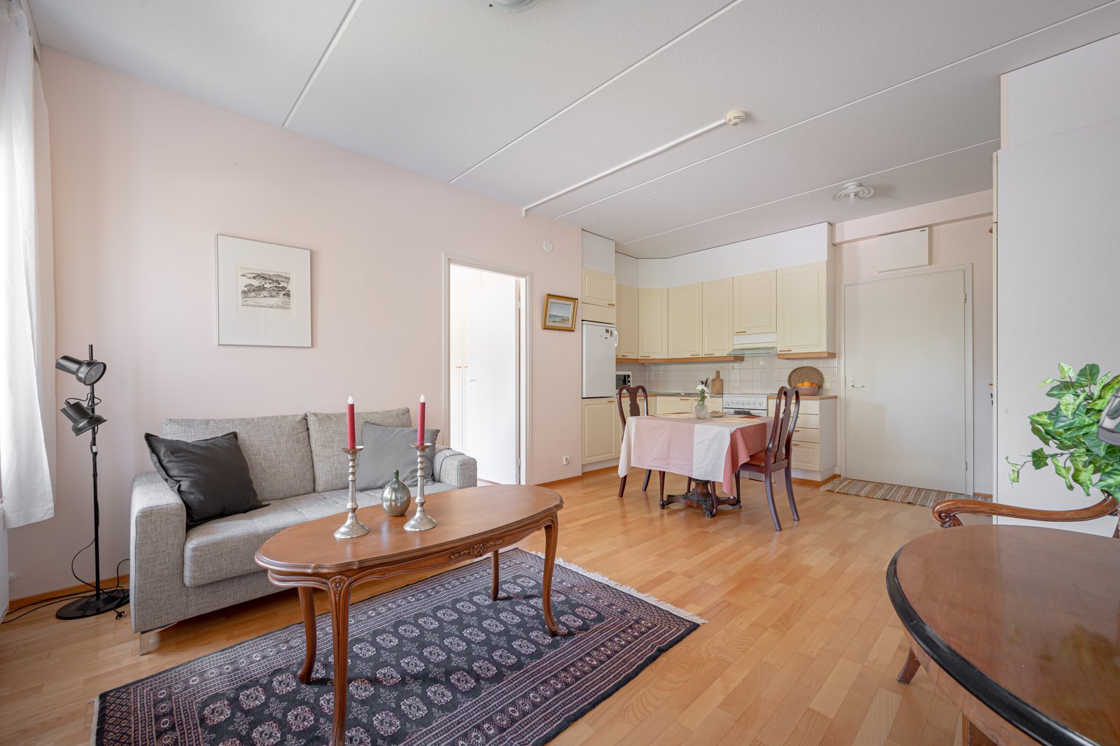 - Viehättävä oleskelutila josta käynti lasitetulle parvekkeelle.