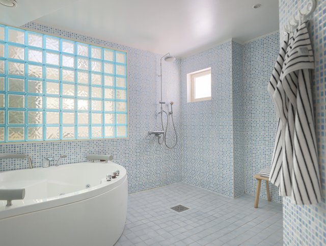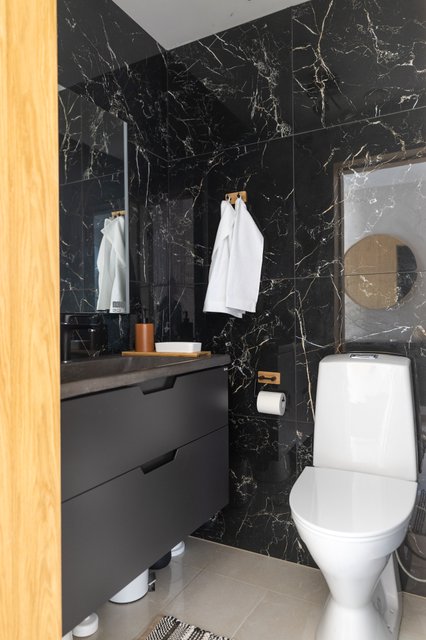 - ALAKERTA: Varustus: suihku, poreamme, kiinteät valaisimet. lattialämmitys (Vesikiertoinen), Lattia: laatta. Seinät: kaakeli. YLÄKERTA: Varustus: wc-istuin suihku, suihkuseinä, kaapisto, kiinteät valaisimet. lattialämmitys (Vesikiertoinen), Lattia: laatta. Seinät: kaakeli.