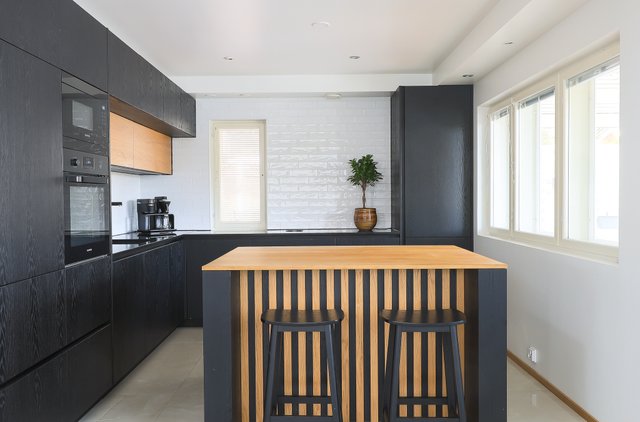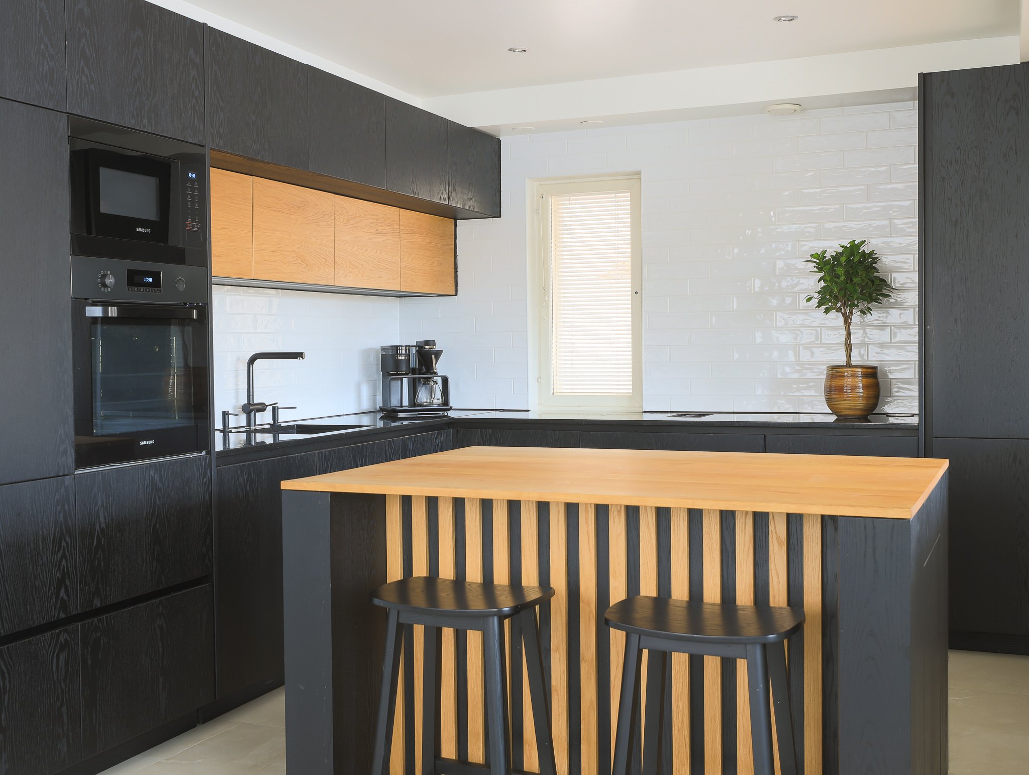 - Tammi keittiö, mittatilaus työnä tehty Varustus: jääkaappi/pakastin, liesituuletin, mikroaaltouuni, astianpesukone, saareke (siirrettävä), kiinteät valaisimet (led). Liesi: Induktioliesi liesituulettimella, erillisuuni. Työtasot: kivi. Lattia: kivi. Seinät: välitila kaakeli, maalattu.