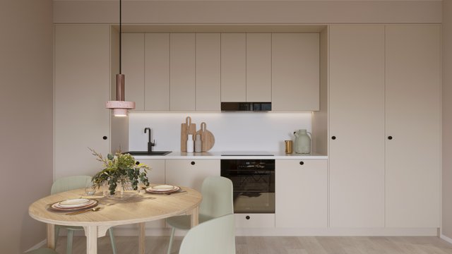 - Keittiö toteutetaan asukas valintana. Lattia: Parketti, jalkalistat käsiteltyä puuta Seinät: Maalattu Kalusteet: Tehdasvalmisteisia kiintokalusteita. Pöytätaso laminaattia tai kivikomposiittia. Pöytätasoon upotettu komposiitti allas ja induktioliesitaso. Kodinkoneet: Kodinkoneet ovat sisustusteeman mukaan: Erillisuuni, astianpesukone ja mikro integroituna. Jää/Pakastinkaappi tai jääkaappi ja pakastinkaappi integroituna. Liesikupu suunnitelmien mukaan.