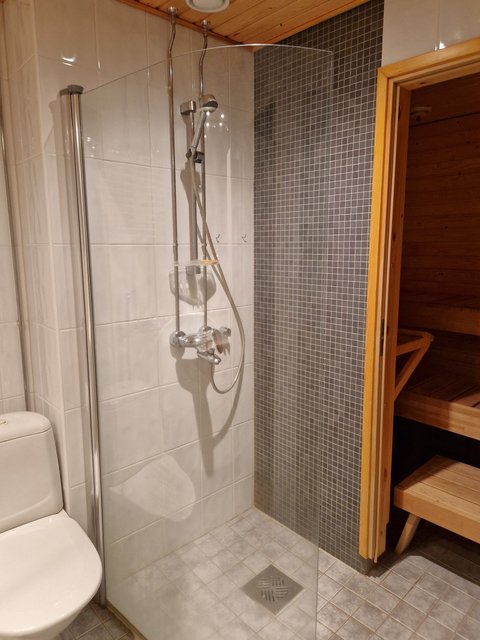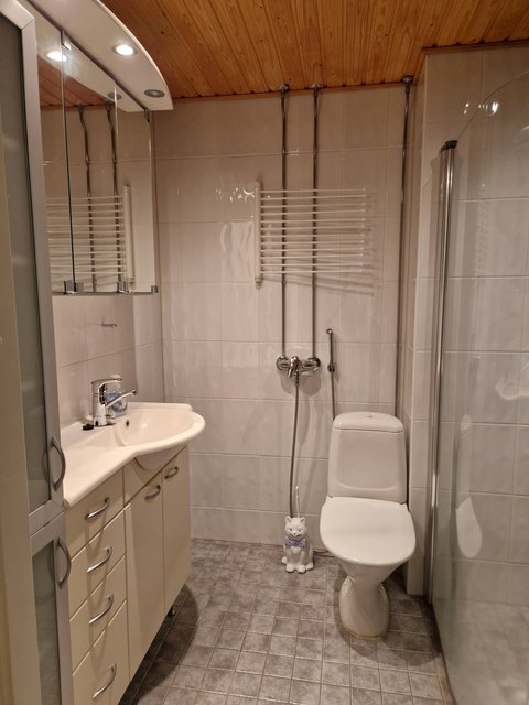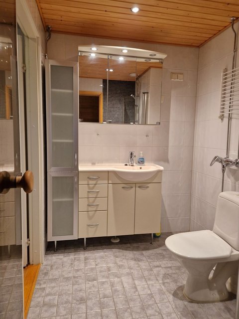 - WC-istuin, suihku, suihkuseinä, pesukoneliitäntä, lattialämmitys, peilikaappi, pesuallas, allaskaappi, ja bidee-suihku