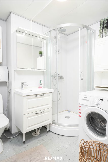 Tyylikkäästi remontoitu kylpyhuone on raikas ja toimiva: suihkukaappi, modernit kalusteet ja pesukonepaikka tekevät tilasta helppokäyttöisen ja siistin.