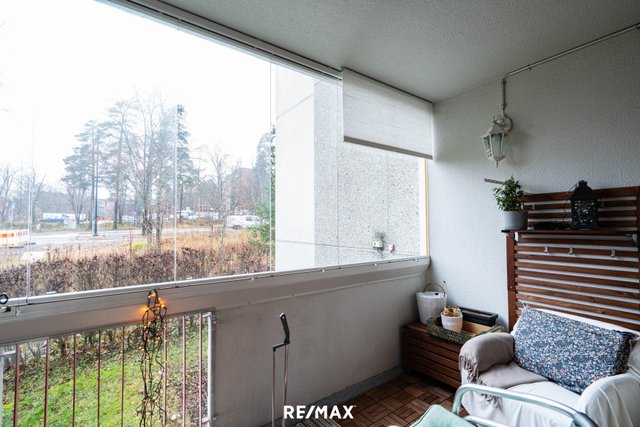 Lasitettu parveke tarjoaa miellyttävän lisätilan – paikka, jossa voi nauttia aamu- tai iltapäiväkahvit suojassa tuulelta ja sateelta.
