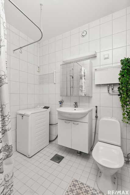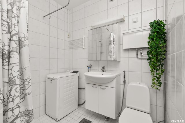 - WC-istuin, suihku, pesukoneliitäntä, peilikaappi, pesuallas, bidee-suihku, ja allaskaappi