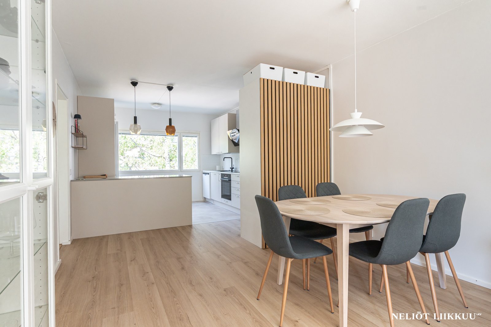 Huoneisto on remontoitu lattiasta kattoon vuonna 2023. Kaikki pinnat on uusittu, lattia vaihdettu, lisätty kaapistoja ja ennen kaikkea keittiö on kokenut upean muodonmuutoksen. Olohuoneen vastainen väliseinä on purettu ja keittiöstä on tehty moderni avokeittiö, jonka saareke erottaa muusta tilasta. Laadukkaat keittiökaapit ja kodinkoneet, totta kai.