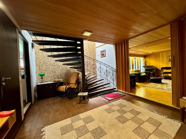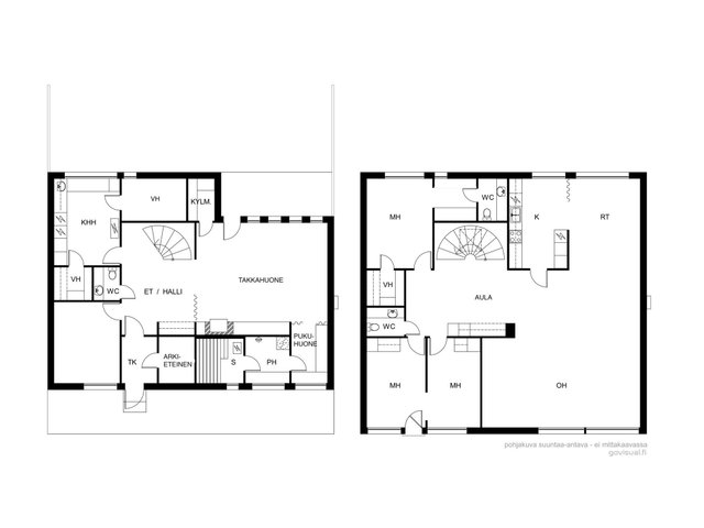 Tuulikaapin yhteydessä on kätevä arkieteinen, joka kätkee sisäänsä isommankin perheen ulkoiluvarusteet. Alakerran takkahuoneen katseenvangitsijana toimii ikkunoiden värikäs lyijylasi, joka tuo särmää koko huoneeseen! Lisäksi alakerrassa on työhuone, erillinen wc sekä kodinhoitohuone kahdella vaatehuoneella. Kylpyhuoneen ja saunan yhteydessä pukeutumistila. Eteisaulasta lähtevät portaat yläkertaan ja suojaisalle takapihalle pääsee takkahuoneesta.