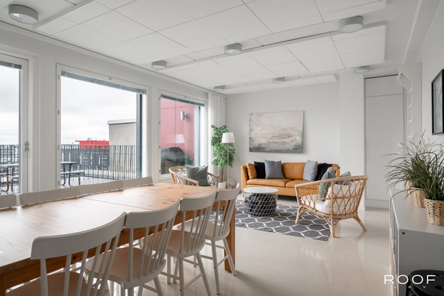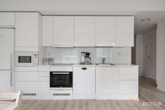 Kodin sydän on avara olohuone–keittiö-yhdistelmä. Makuuhuoneet sijaitsevat tilan eri puolilla, tarjoten rauhaa ja yksityisyyttä niin perheen eri jäsenille kuin etätyöskentelyynkin. Toisesta makuuhuoneesta on käynti asunnon lasitetulle parvekkeelle, josta avautuvat kauniit merelliset näkymät.