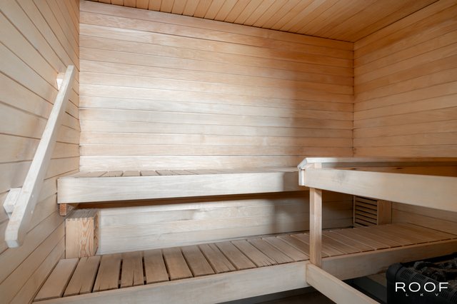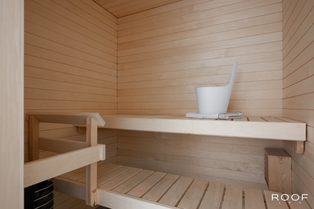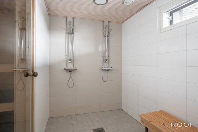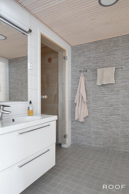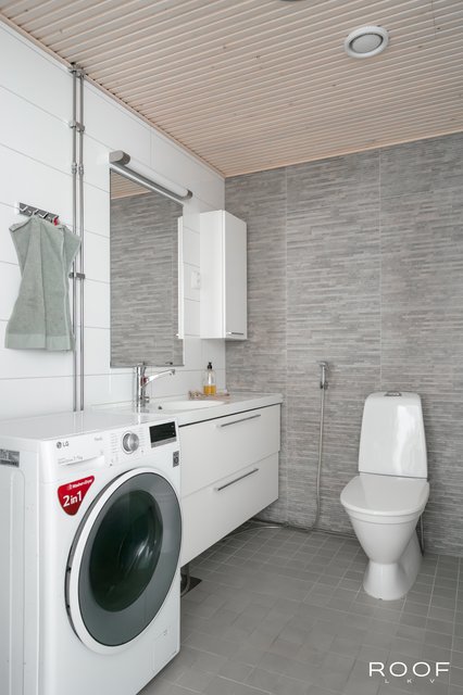Arkea helpottavat oma sauna sekä erillinen wc, joka on yhdistetty käytännölliseen kodinhoitotilaan – toimiva ratkaisu pyykkihuoltoon ja arjen sujuvuuteen.