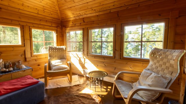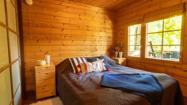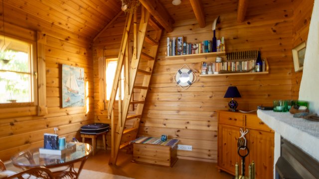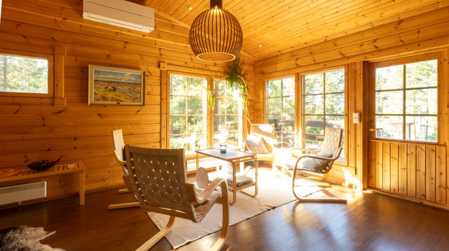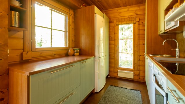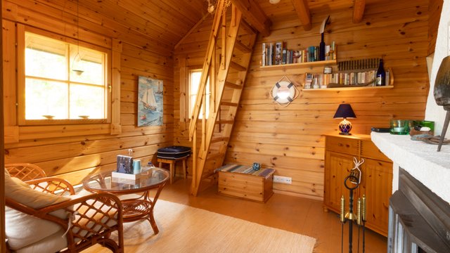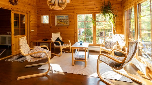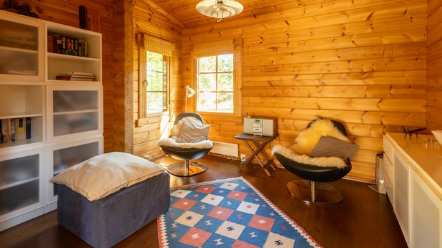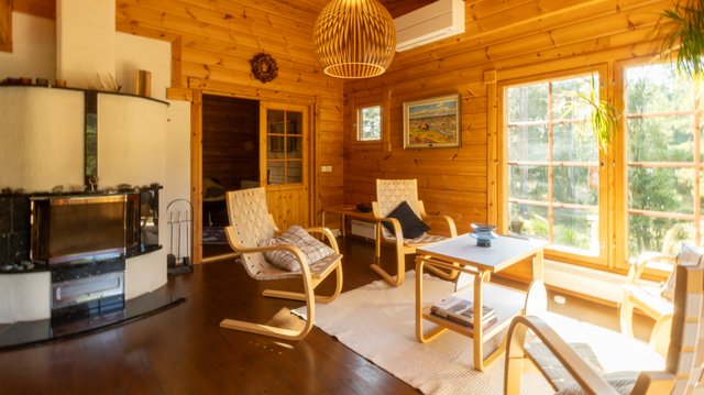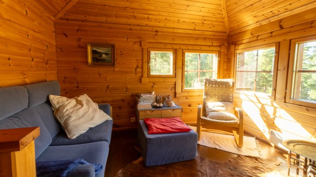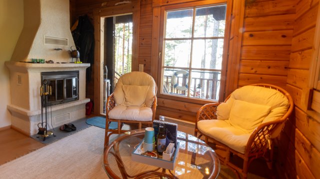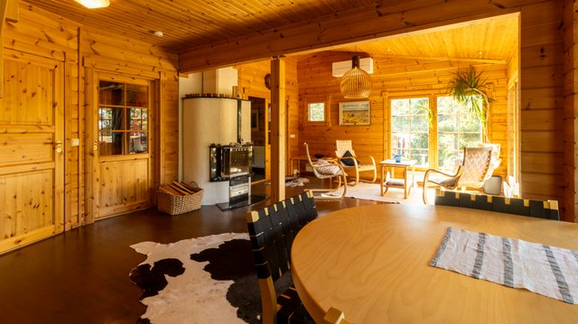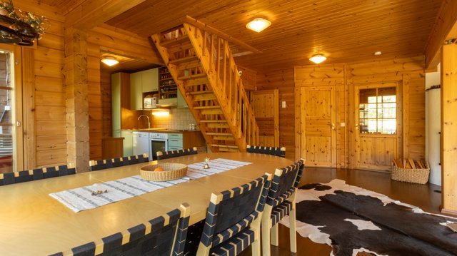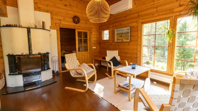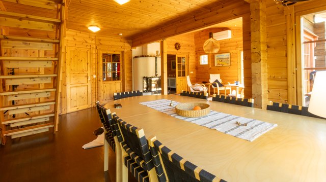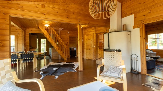 Tilavassa olohuoneessa on varaava takka, joka luo lämpöä ja tunnelmaa viileinä iltoina, lisäksi lämmitystä tehostaa ilmanlämpöpumppu. Keittiö on hyvin varusteltu, joten ruoanlaitto sujuu vaivattomasti. Päärakennuksessa on kaksi makuuhuonetta ja parvi, joka tarjoaa mukavasti lisätilaa perheelle tai ystäville. Mukavuuden kruunaavat WC ja suihku.