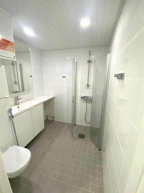 - WC-istuin, suihku, pesukoneliitäntä, lattialämmitys, pesuallas, peilikaappi, ja suihkuseinä