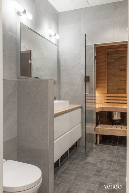 - WC-istuin, suihkuseinä, pesukoneliitäntä, peili, allaskaappi, ja bidee-suihku
