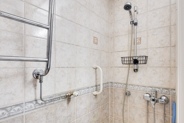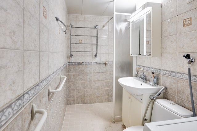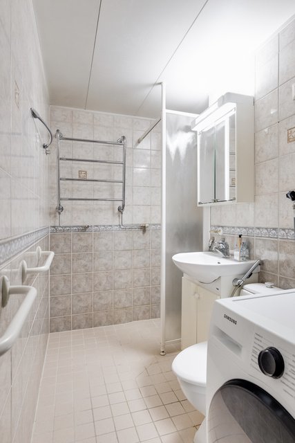- WC-istuin, suihku, suihkuseinä, pesukoneliitäntä, peilikaappi, peili, pesuallas, allaskaappi, ja bidee-suihku