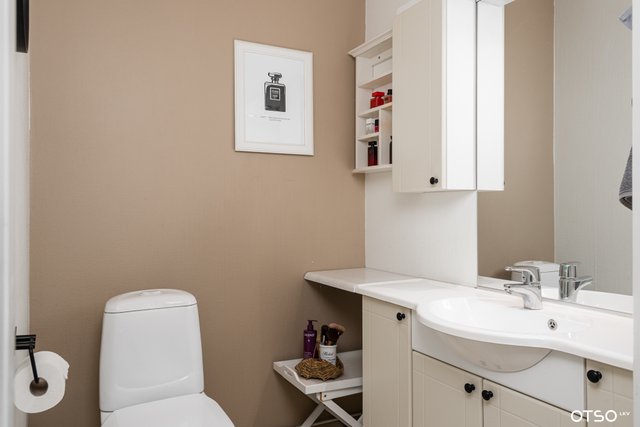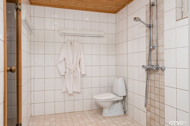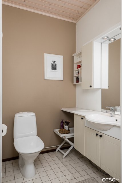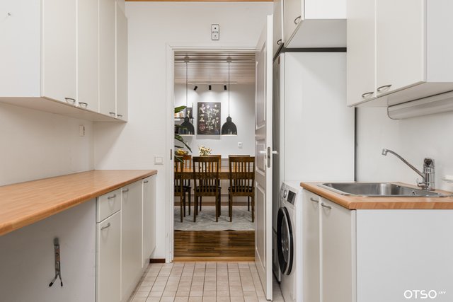 - Pesukoneliitäntä, lattialämmitys, pesuallas, lattiakaivo, silityspöytä/taso, tila pesutornille, ja pöytätaso