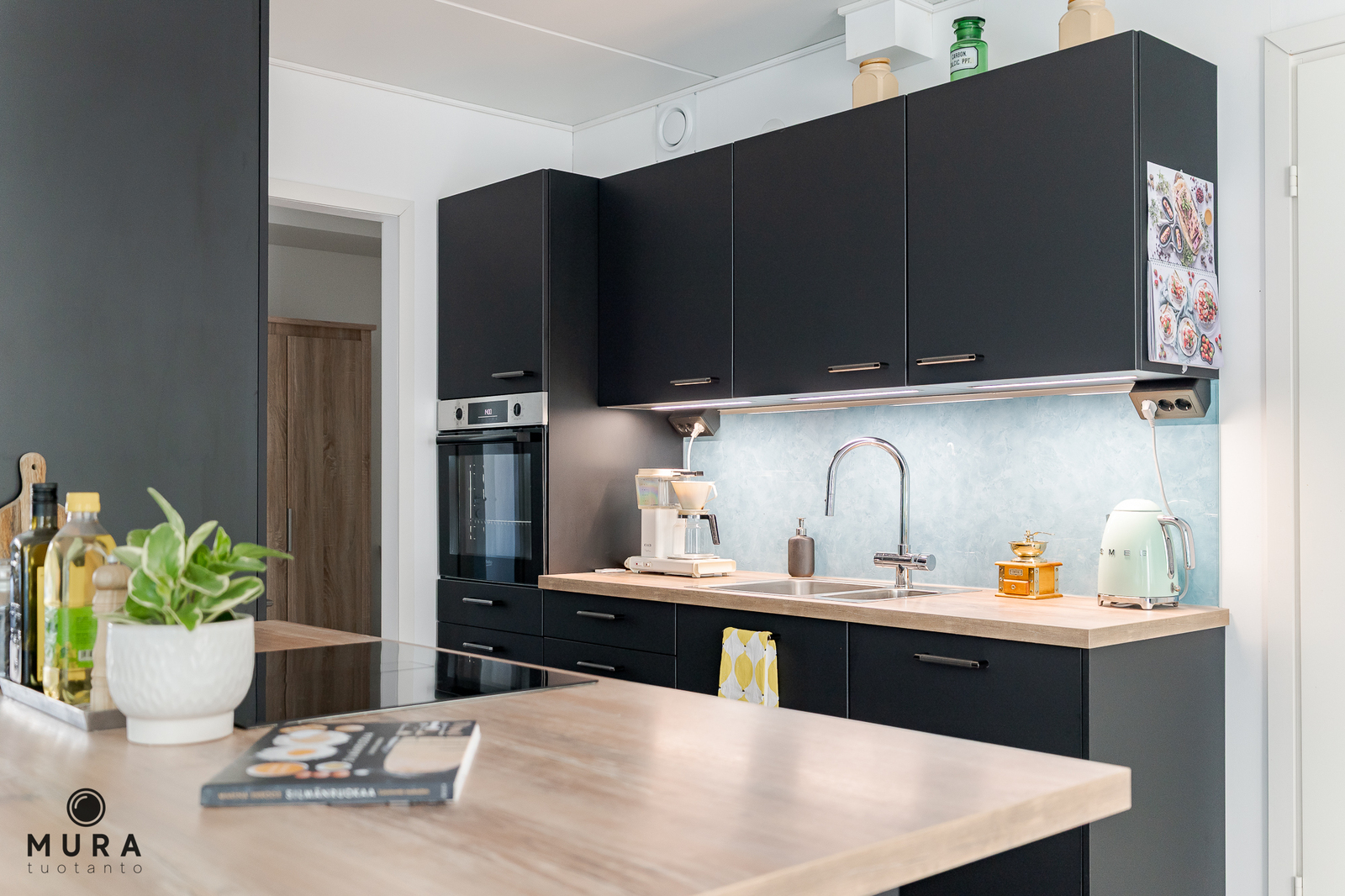 Koko asunto on remontoitu lattiasta kattoon vuonna 2021. On käyty läpi lattiat, jotka ovat samaa materiaalia koko asunnossa sekä maalattu seinäpinnat ja hieman muokattu makuuhuoneiden tiloja ja lisätty kaappeja asuntoon. Upeimpana luomuksena on kodin keittiö, joka hurmaa sekä ulkonäöllään että toimivuudellaan. Keittiön seinä on purettu ja saatu olohuone-keittiö kauniiksi avoimeksi kokonaisuudeksi. Pinnoissa on otettu huomioon käytännöllisyys ja pieniä extroja tehty omaan makuun mm. valaistusta saa himmennettyä ja muutettua värisävyä. Löytyypä täältä pieni aamiaiskaappikin! Tähän kyllä ihastuu!