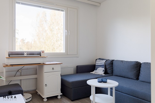 - Vinyylilattia, seinät maalattu. Toisessa makuuhuoneessa liukuovikaapistot.