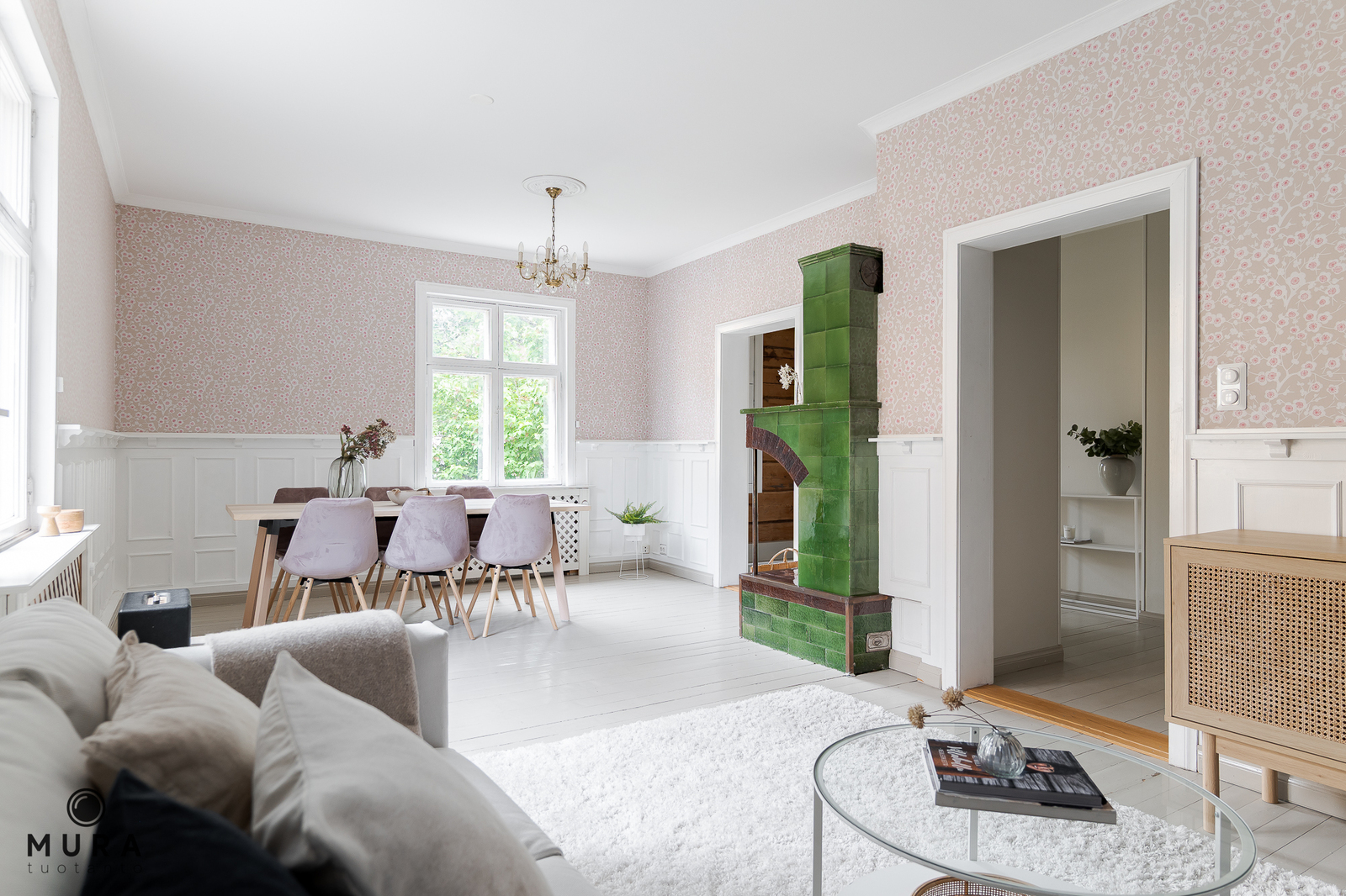 - Avara ja valoisa olohuone, jonka sydämenä upea takka.