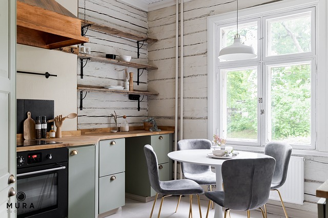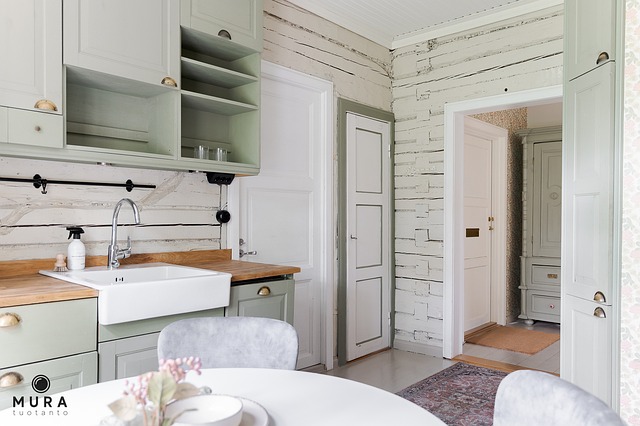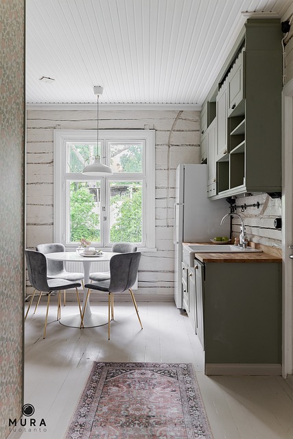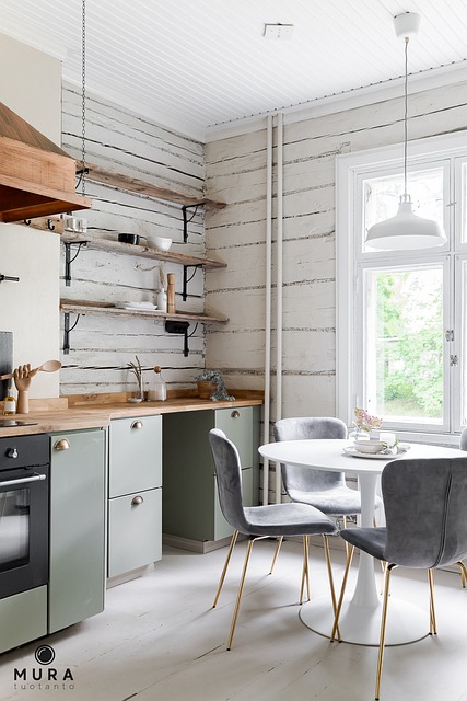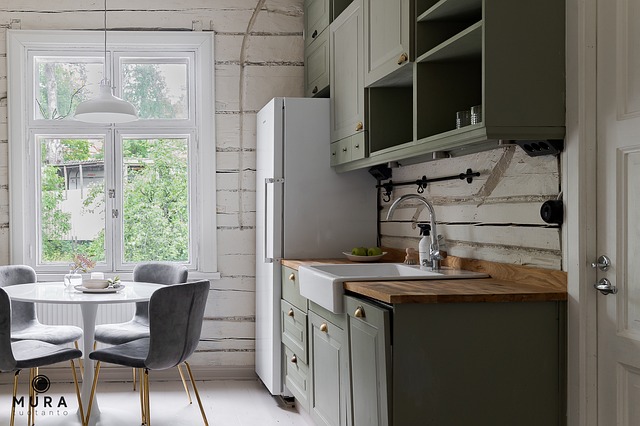 - Tyylikäs keittiö, jossa hirsiseinät ja lautalattia. Keittiössä induktioliesi, liesituuletin, erillisuuni, jääkaappi/ pakastin, integroitu astianpesukone.
