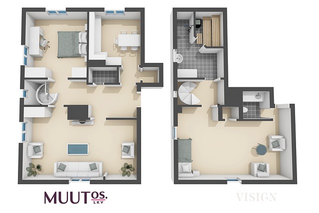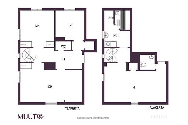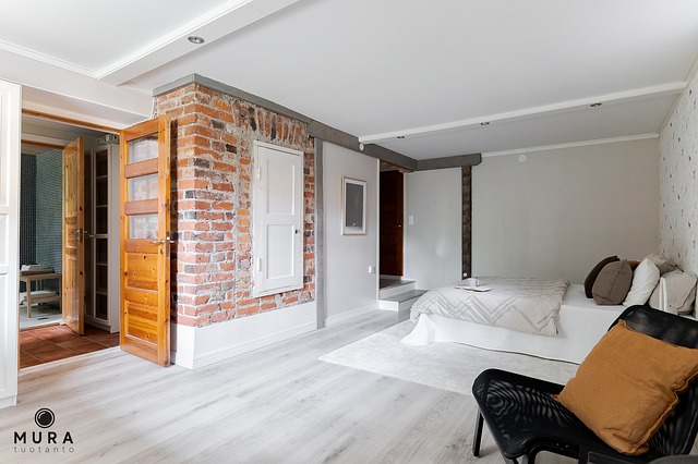 - Yläkerrassa makuuhuone, jossa lautalattia. Alakerrassa monikäyttöinen tila, jossa laminaattilattia.
