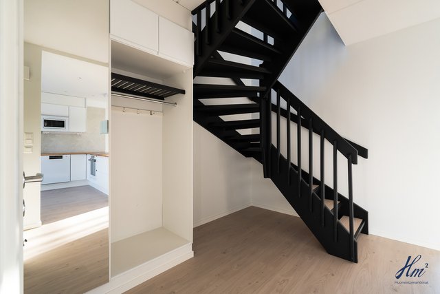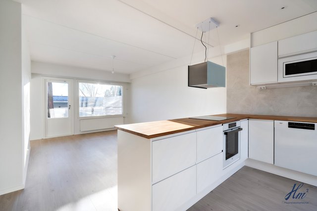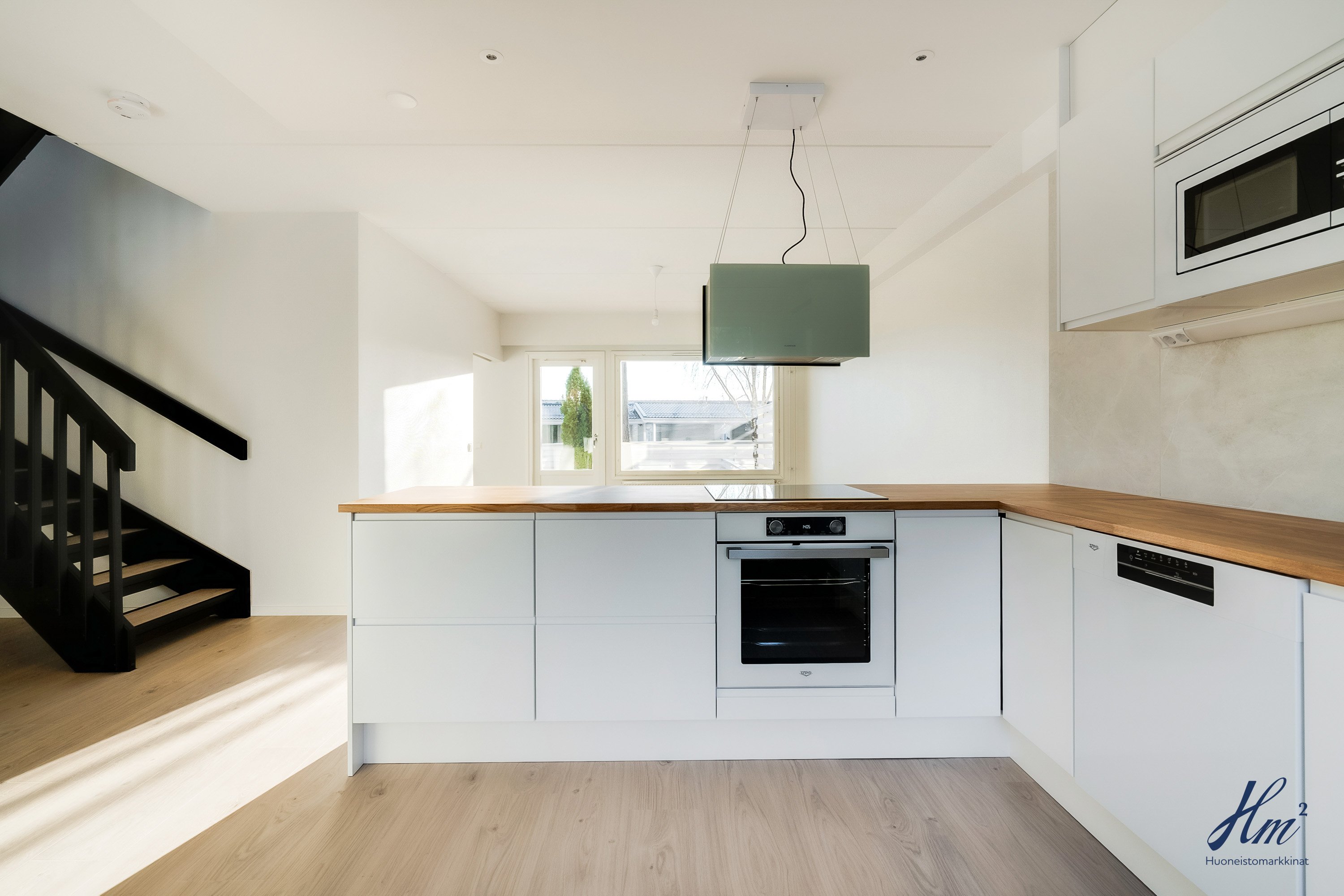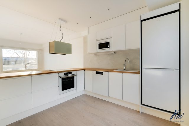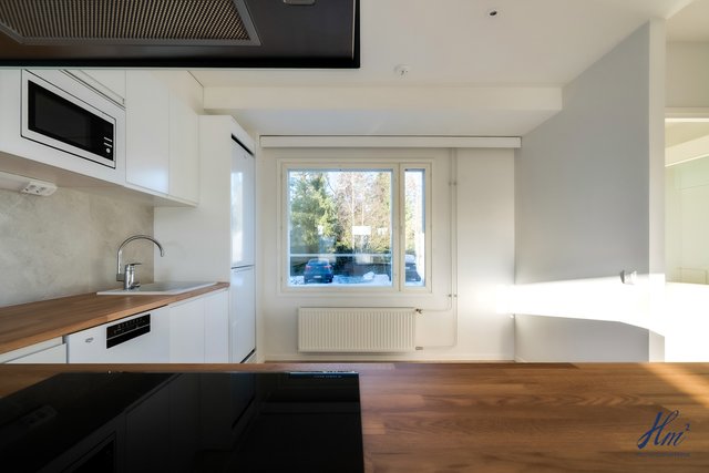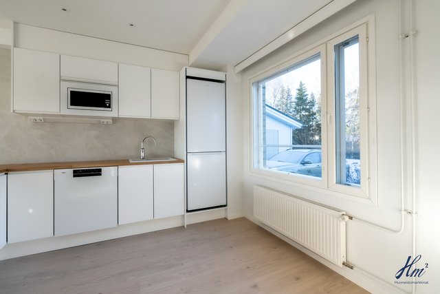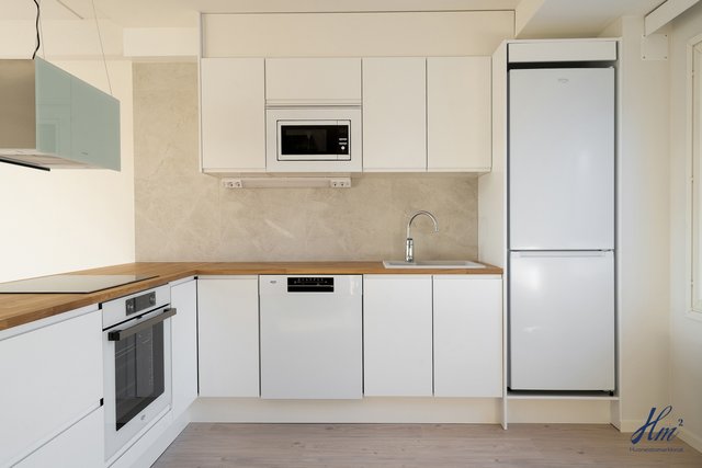 - Keittiön varusteina jääkaappi/pakastin, induktioliesi, erillisuuni, liesituuletin, astianpesukone, mikroaaltouuni ja kiinteät valaisimet. Lattia vinyylilankkua.