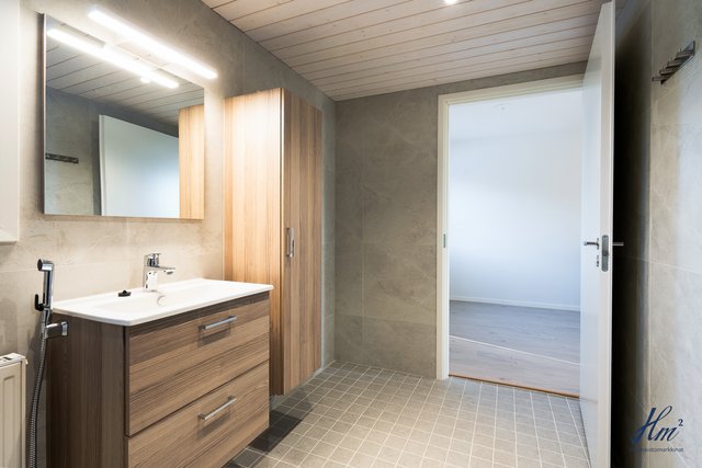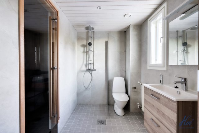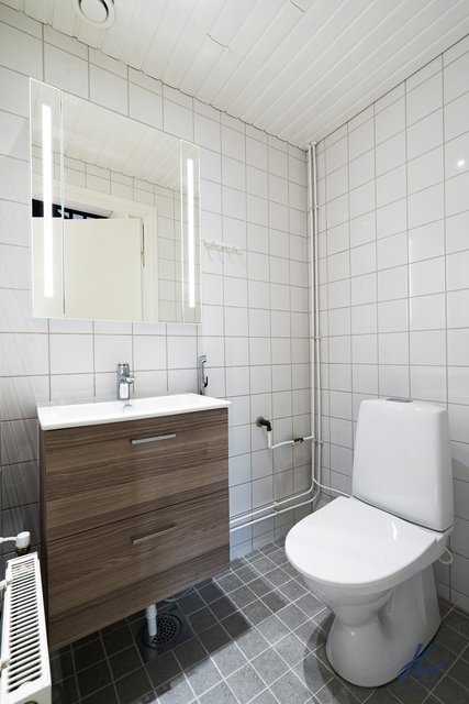 - Kylpyhuone kokonaan laattaa. Varusteina suihku, suihkuseinä, allaskaappi, peili, kylpyhuonekaapisto, pesukoneliitäntä ja wc-istuin.