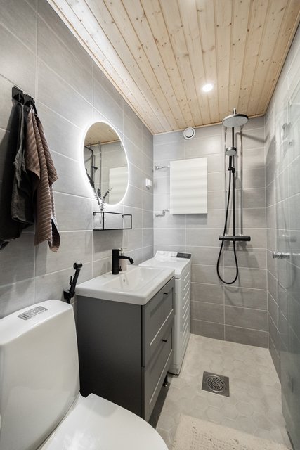 - WC-istuin, suihku, allaskaappi, peili, pesuallas, bidee-suihku, ja suihkuseinä
