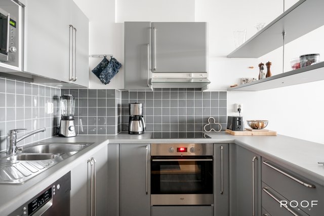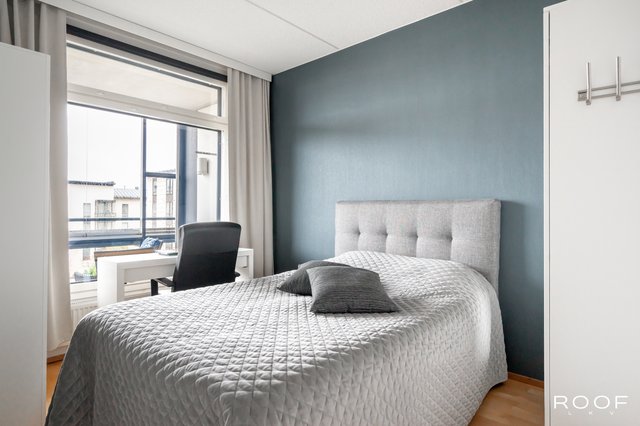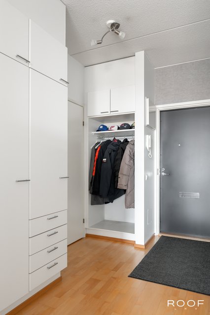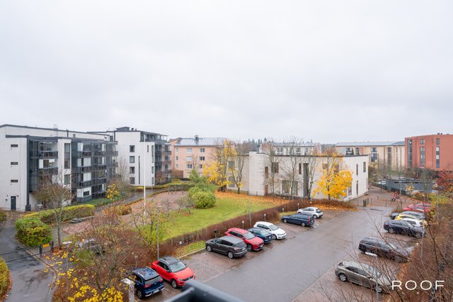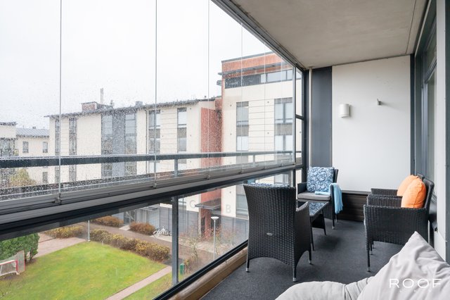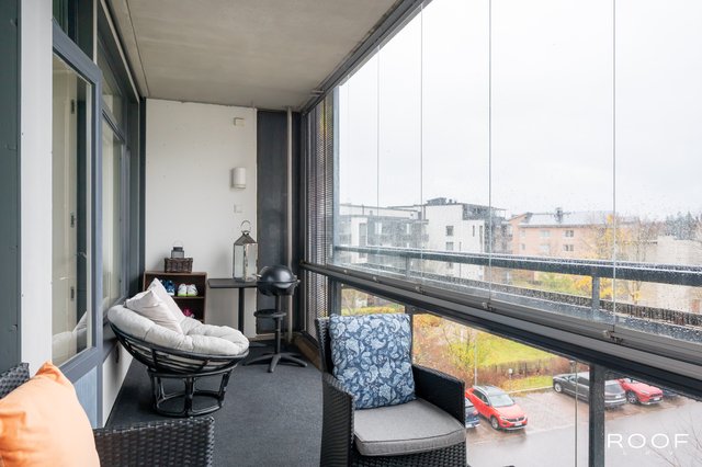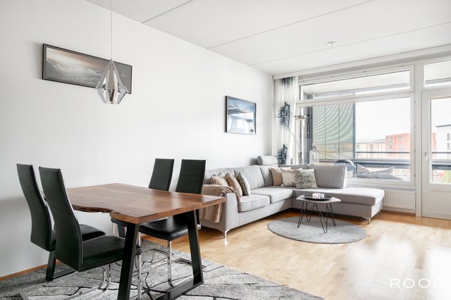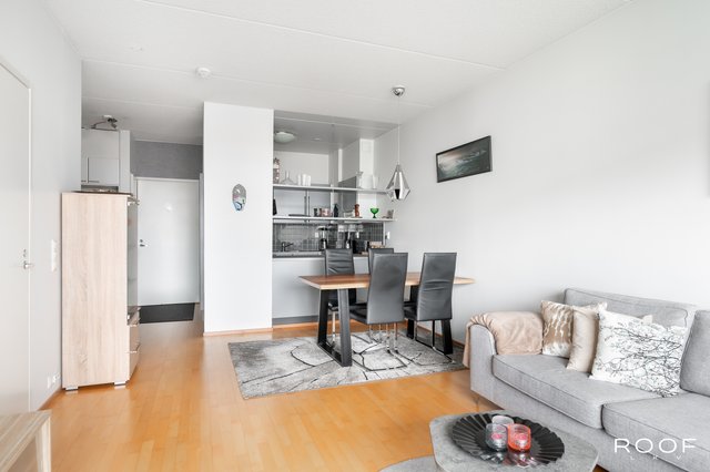 Olohuone toimii tämän kodin sydämenä, ja sen suuret ikkunat tuovat runsaasti luonnonvaloa sisään. Lisäksi olohuoneesta on käynti koko huoneiston levyiselle lasitetulle parvekkeelle. Keittiö sulautuu sulavasti osaksi olohuonetta, mutta on kuitenkin erotettu omalla seinällään, mikä antaa sille oman tilansa. Keittiössä on hyvin kaappi- ja laskutilaa.
