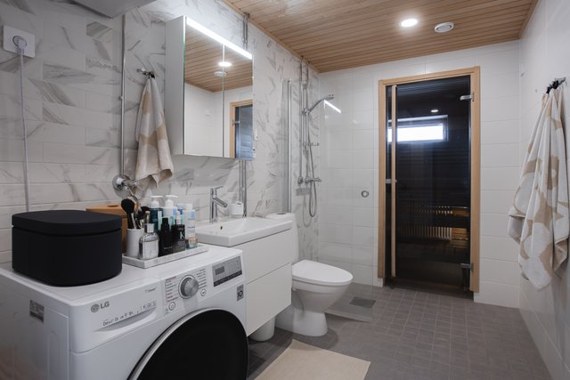 - WC-istuin, suihku, suihkuseinä, pesukoneliitäntä, lattialämmitys, peilikaappi, bidee-suihku, ja allaskaappi