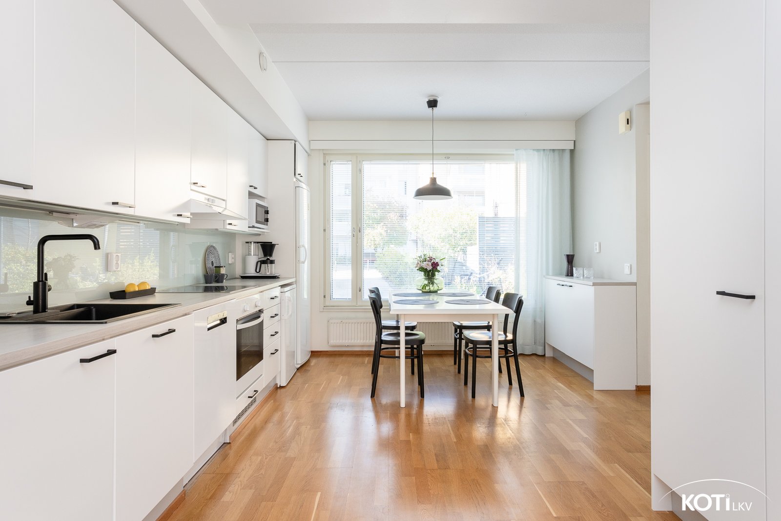 - Varustus: jääkaappi (korkea), pakastin (matala), liesikupu, astianpesukone. Liesi: keraaminen, erillisuuni. Työtasot: laminaatti, välitila on lasia, erillinen matala kaapisto ruokailutilan vieressä, korkeat kaapit keittiön ja olohuoneen välissä. Lattia: parketti. Seinät: maalattu.